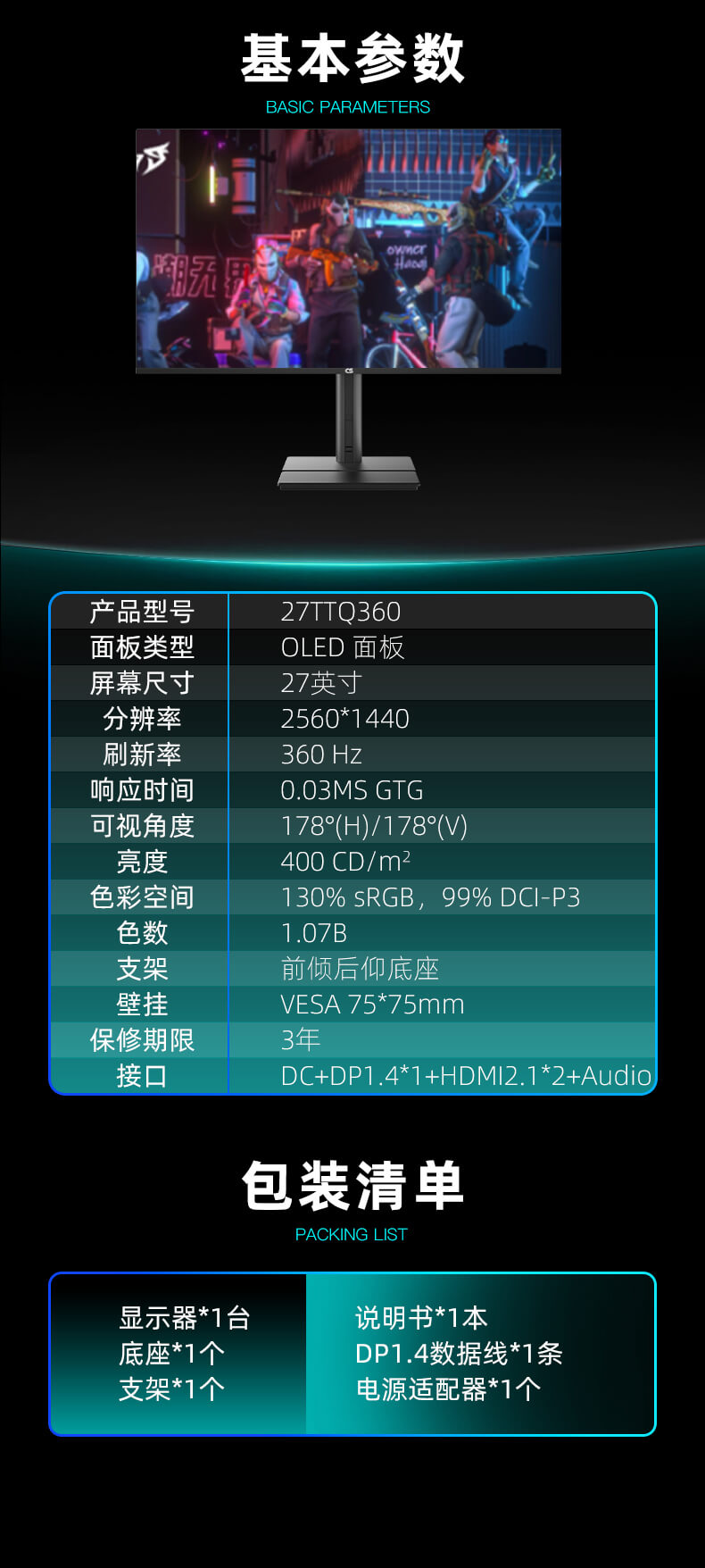 | 附件/配件 Accessories | 适配器、电源线、 底座、底座支架、DP线 | ||